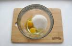 Включают духовой шкаф и прогревают до 170 градусов. Для приготовления бисквита, соединяют сахарный песок с яйцами и взбивают около 7 минут.