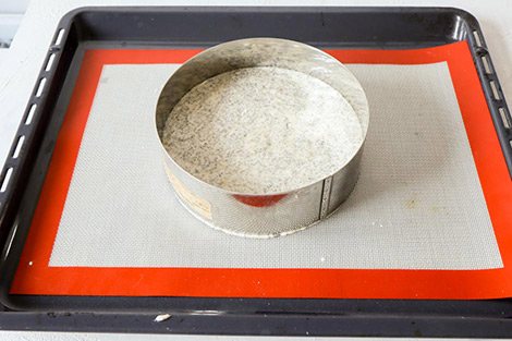 Выливаем тесто в кольцо без дна. Чтобы тесто не просочилось, можно присыпать края мукой. У меня ровный противень, коврик и кольцо хорошо стыкуются, нет расстояния, поэтому я не использовала муку. Вытекло совсем незначительное количество теста.