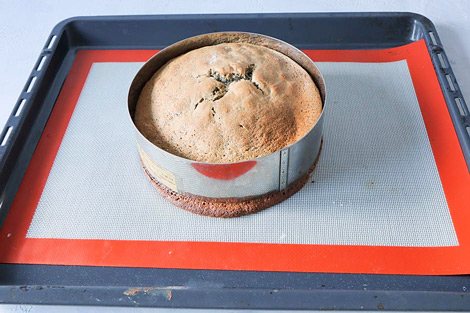 Ставим выпекаться в заранее разогретую духовку при 180º около 40 минут. Готовность проверяем зубочисткой, выходит сухой — значит готово. В духовке, возможно, корж немного вздуется в серединке, но во время остывания он примет ровный вид.