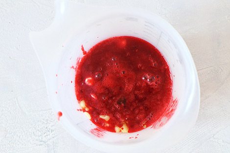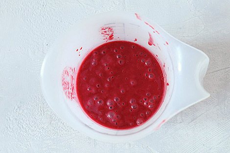 Будем делать мусс с малиной. Я использовала замороженные ягоды. Когда они растаяли, пробила блендером и процедила через сито. Ягоды, которые использовала я, были кислыми, но сахар я не добавляла. И в рецепте его не указываю. В белом шоколаде большое количество сахара и его обычно хватает, чтобы сбалансировать мусс по сладости. Кроме того, в торте будут сладкая начинка и бисквит, поэтому малиновый мусс с легкой кислинкой придется в самый раз.