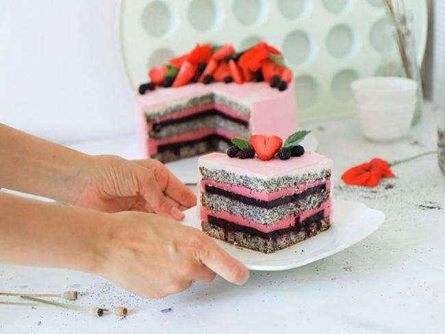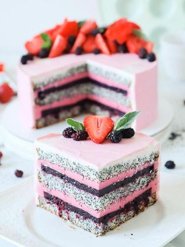 - При подаче торт лучше нарезать на порции и украсить фруктами или ягодами, с маскарпоне прекрасно сочетается клубника. Вкусный и легкий маковый торт готов!