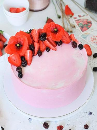 Я писала, что мой источник вдохновения — это цветы мака, которые весь май и июнь цветут на полях. Для декора я собрала букетик цветов. Их не найти в цветочном магазине, они очень быстро вянут, а от резкого движения опадают лепестки. Мимолетная красота. Также я дождалась момента, когда поспеют первые ягоды шелковицы. Они составляют контраст с цветами и дополняют их. Ягоды клубники той же цветовой гаммы, что и цветы, они делают декор объемный и законченным. В блоге есть статья о том, как украшать торты клубникой. Я сняла видео, чтобы примеры были наглядными.